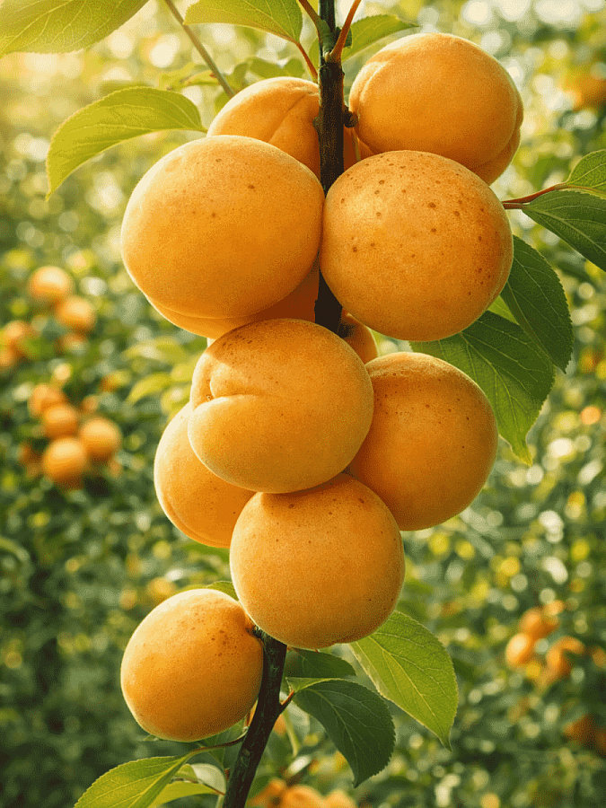 Саженцы абрикоса Десертный характеризуются хорошей зимостойкостью и не уступают южным сортам по качеству и количеству плодов. Взрослое дерево достигает 5 метров, это нужно учитывать при размещении крупномера абрикоса. Описание плодов:
