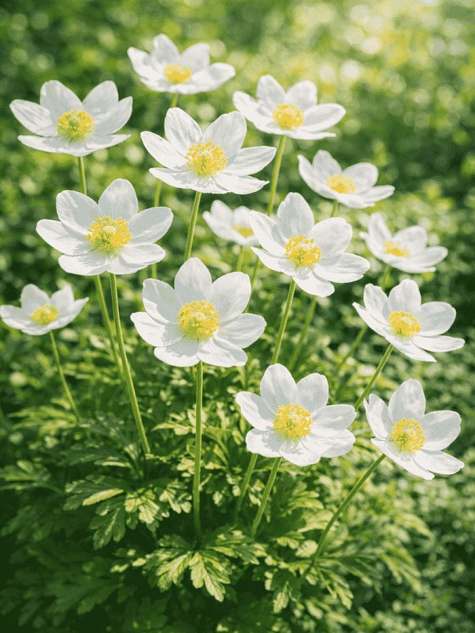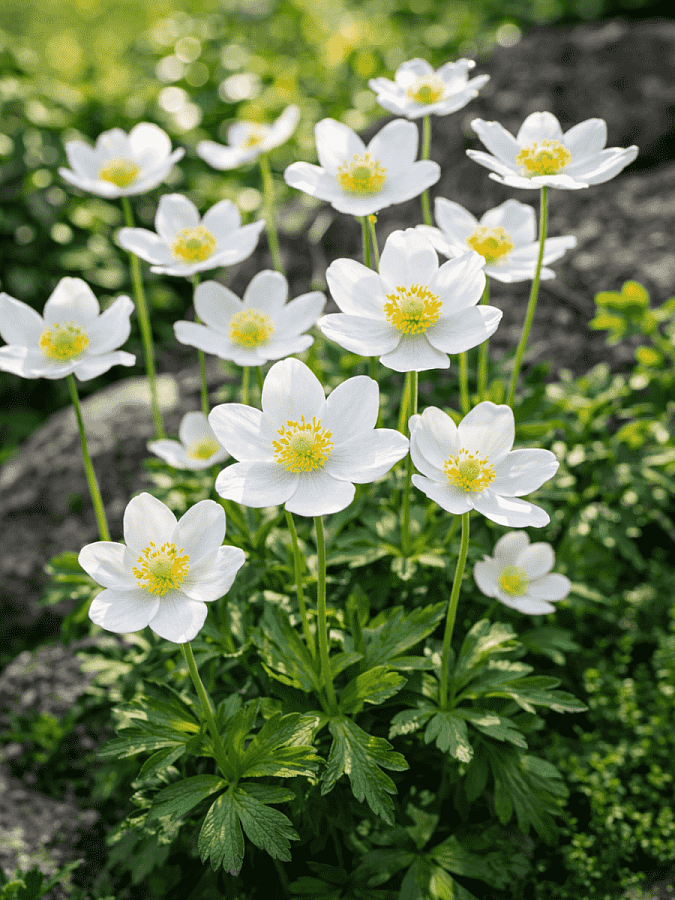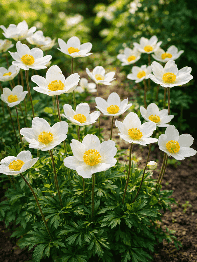 Саженцы анемоны лесной (Anemone sylvestris) обладают простой неброской красотой, цветы часто используются для создания нежных букетов невесты. Побеги растения достигают в длину около 20 сантиметров. В их нижней части сосредоточены резные зеленые листья. В конце мая растение выпускает цветоносы с одним крупным пятилепестковым цветком (до 7 сантиметров в диаметре) белого цвета с желтой серединкой. Цветет анемона около 3 недель. Предпочитает затененные места, хорошо развивается под деревьями и кустарниками. Предпочитает легкие, плодородные, достаточно увлажненные почвы. Анемона самостоятельно размножается самосевом.