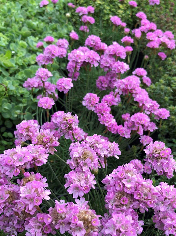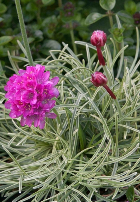 Рассада армерии приморской Nifty Thrifty - один из наиболее эффективных видов этого растения. Благодаря узким листьям с кремово-белой окантовкой взрослый куст сохраняет декоративность на протяжении всего сезона. В мае среди листвы распускаются пышные шарообразные соцветия, состоящие из розовых цветов.