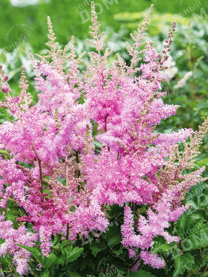 Рассада астильбы Арендса Америка(America): изящные метелки нежно-розовых мелких цветов добавят свежести и новизны любому саду и прекрасно оживят тенистые участки. Длинные ветвистые соцветия на темно-красных черенках возвышаются над облаком точеных зеленых листьев с резными краями. Цветение проходит в июле-августе и длится от 15 до 30 дней.