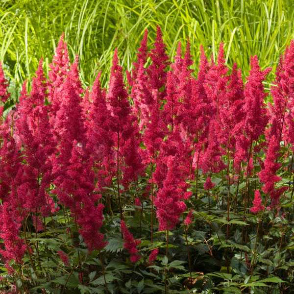 Рассада Астильба японская Везувий (Vesuvius) в пик своего цветения достигает в размере не более 60 сантиметров. Только распустившиеся из семян молодые листья имеют бордовый цвет, который в процессе созревания цветка преобразуется в темно-зеленый, а черешки становятся красными. Не крупное соцветие по форме напоминающее метелку и в высоту достигает 15 сантиметров. Цветовая палитра расположилась от лососево-красных до карминно-красных оттенков. Растение проявляет повышенную устойчивость различным вредителям. Период цветения длится с июля по август, в среднем до 30 дней. К отличительным особенностям Астильбы японской Везувий можно отнести: