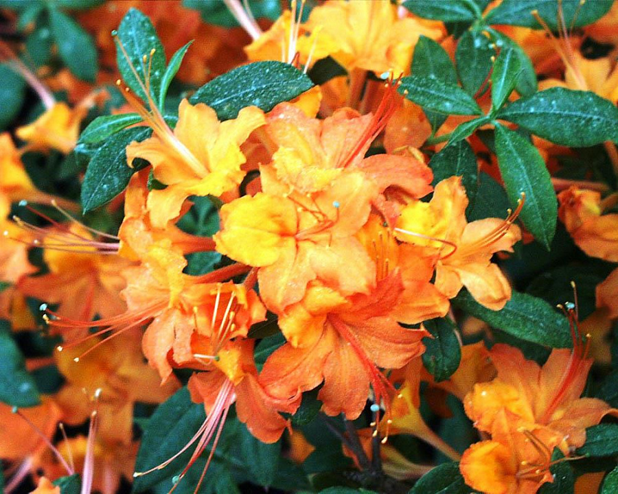 Саженцы Азалии гибридной Кокцинеа Специоза (Azalea, Hotspur Red) предпочитают кислую почву, умеренный полив и полутень. Это идеальные условия для формирования крепкого ветвистого кустика высотой до 2 метров. Диаметр растения не превышает 120 сантиметров. Первые цветы появляются в мае, обладают приятным ароматом и радуют прохожих на протяжении 5-6 недель. Цветы собраны в зонтообразные соцветия, оттенок насыщенно оранжевый. Листва удлиненная, эллиптическая, ярко-зеленого цвета. Культуру успешно используют в декоративных целях, а также для приготовления эфирных масел.