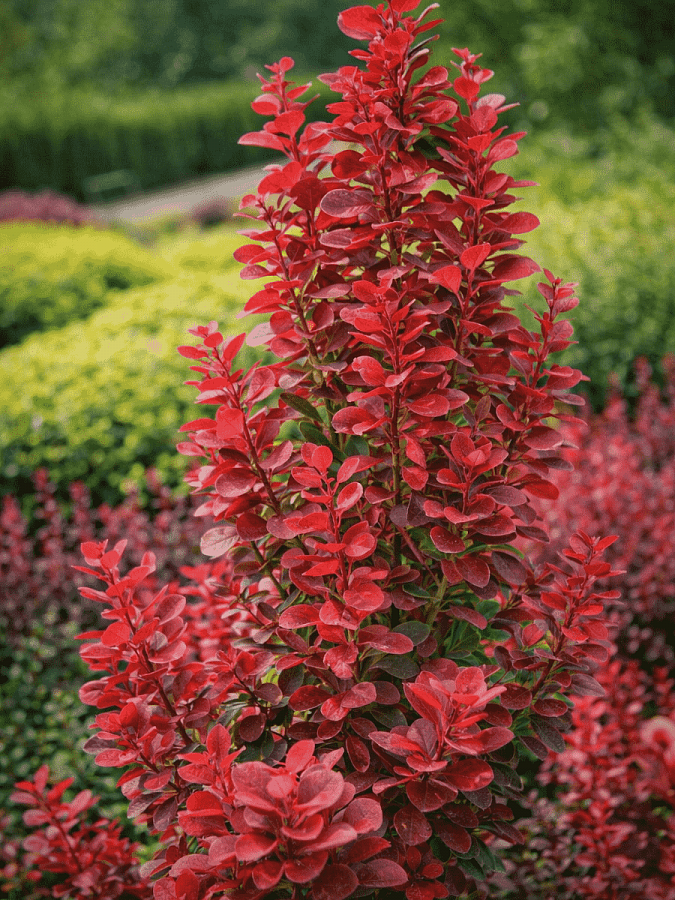 Саженцы Барбариса (берберис) Тунберга Флоренс (Florence) вырастают в многолетник внушительного размера (высота до 140 сантиметров, ширина до 60 сантиметров), со стройной колонновидной формой густой кроны. Привлекательна сложная окраска аккуратной овальной листвы: на ветвях, растущих по периметру кроны, она розово-красная, внутренние побеги одеты в салатовый наряд. Осенью оттенок кроны сменяется на багрово-красный.