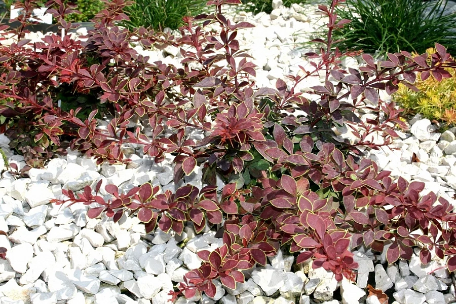 Саженцы барбариса Тунберга сорта Коронита (Coronita) привлекают внимание своим эффектным видом. Даже колючки этого растения смотрятся весьма привлекательно и необычно, благодаря своей кремово-розовой окраске. Кустарник подходит для групповых посадок и создания непроходимых ограждений.