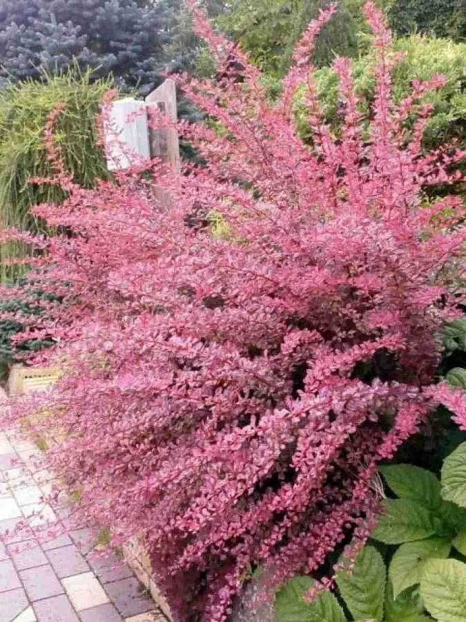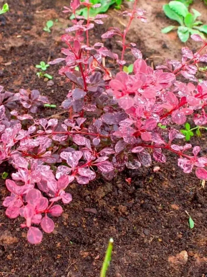 Саженцы кустарника барбариса Розовая королева (Pink Queen) – это декоративное лиственное растение с раскидистой кроной и практически горизонтально размещенными красными побегами. Окончательно созревшие листья приобретают пурпурно-красный цвет, они небольшие и на них постепенно образуются розовые крапинки. Цветы на кустарнике желтые. Растение лучше развивается на солнечном месте, к почвам особых требований не имеется и может расти на любом грунте. Розовая королева плохо переносит обильное увлажнение. Она с успехом растет в черте города. Кустарник хорошо будет выглядеть в группах с другими многолетними растениями, в композициях с включением древесно-кустарниковых сортов, в живых бордюрах и изгородях.