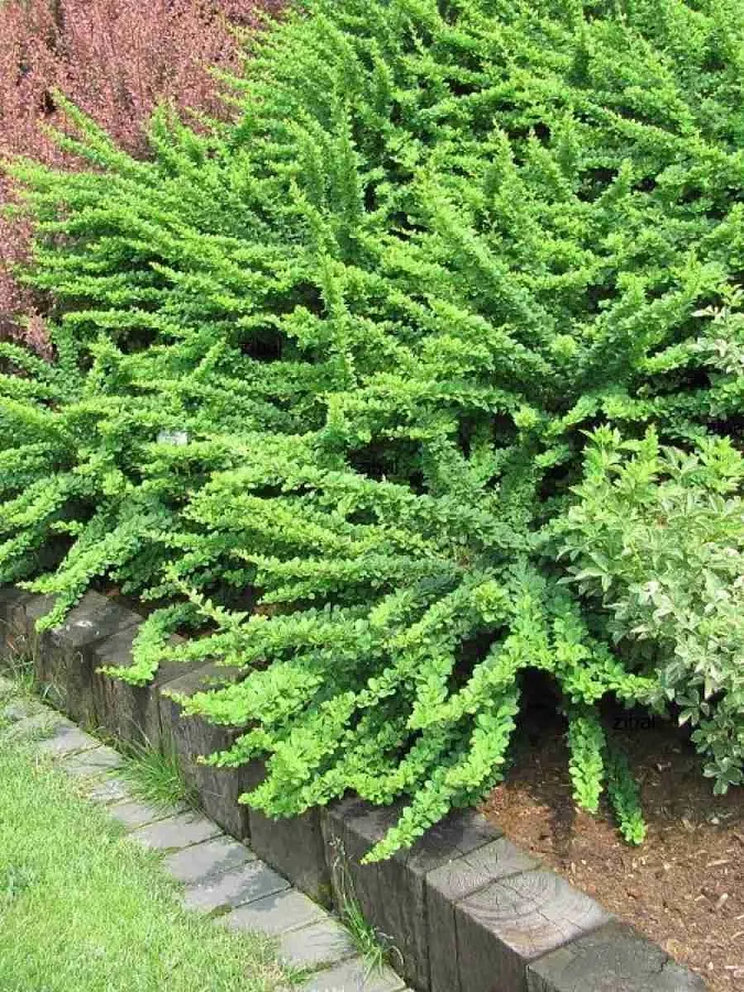 Саженцы кустарника барбариса Зеленый ковер (Green Carpet) это невообразимо красивый сорт, который впервые был выращен в Голландии. Высота растения составляет 50 см, а диаметр доходит до 1,2 метров. Часто крупномер барбариса Зеленый ковер используется с целью подбивки кустарников большой высоты в качестве яркого акцента в композиции сада. Живая изгородь, созданная при помощи этого сорта барбариса, радует взор в течение круглого года: летом – это блестящая глянцевая листва, а в зимний период – плоды красного цвета. Цветение кустарника начинается в мае-июне. на нем появляются одиночные или собранные в соцветия цветы. Внутри они желтого цвета, а сверху красные, располагаются по всей длине побега. Плоды растения созревают в сентябре, они блестящие и продолговатые, их много, они имеют красный и розовый оттенок. Плоды продолжают украшать куст даже после опадания листьев осенью и порой держатся всю зиму. Сорт Зеленый ковер очень любит освещенные участки и хорошо переносит засуху. Также он неприхотлив к плодородию почвы, но лучше развивается на щелочном грунте. Растение отлично приживается в условиях городских парков.