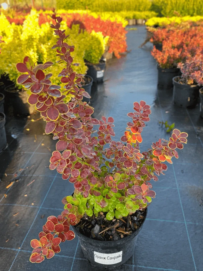 Барбарис тунберга ориндж санрайз - это волшебное растение, которое привнесет яркие краски и радость в ваш сад. Его темно-красные листья с золотистой каймой создадут неповторимый акцент в любом ландшафте. Этот кустарник имеет компактную форму и достигает высоты до 80 см, что делает его идеальным выбором для альпинариев, газонов, живых изгородей или одиночных посадок.