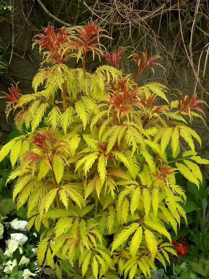 Бузина красная sutherland gold - это уникальное растение с золотисто-жёлтыми листьями, которые придают саду неповторимый шарм и яркость. Этот сорт бузины отличается высотой до 150 см и кремово-жёлтыми цветками, расцветающими в мае и июне. Благодаря своей медно-красно-бронзовой окраске листвы летом, растение привлекает внимание и создает уютную атмосферу в саду.