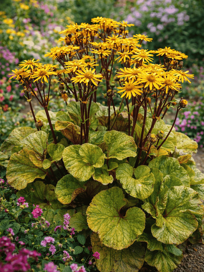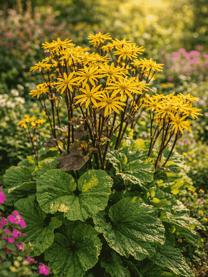Бузульник гибридный garden confetti - это удивительное растение, которое поразит вас своей красотой и изяществом. Его стебли высотой от 70 до 90 см украшены яркими желтыми цветками, которые расцветают в июле и августе, придавая вашему саду неповторимый вид. Листья бузульника garden confetti имеют зеленую окраску летом, создавая прекрасный контраст с яркими цветами.