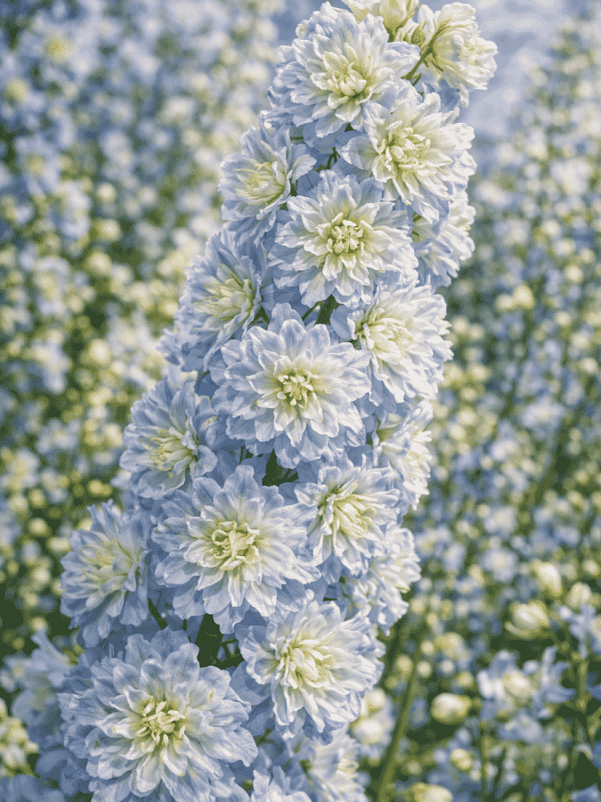 Дельфиниум культурный Delphi's Moonlight - это изысканное растение с голубовато-розовыми цветками и белым глазком, которое поражает своей красотой и изяществом. Сорт этого дельфиниума отличается высотой до 150-170 см, что делает его прекрасным украшением для сада или огорода. Цветение наступает в июне-июле, радуя глаз своими нежными оттенками. Растение предпочитает солнечные места и может быть посажено как в групповые, так и одиночные посадки.