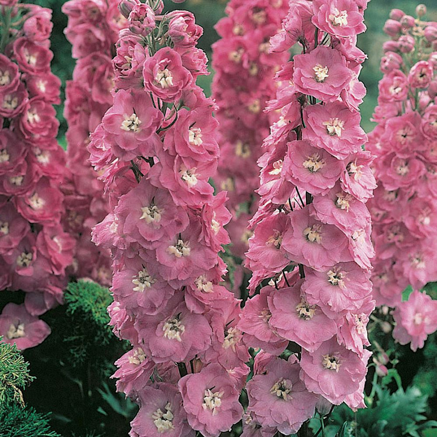 Рассада дельфиниума Астолат (Pacific Giant Astolat) вырастает в высоту около 150 см. Расцветает в июне и радует цветением около 60 дней. Цветки достаточно крупные, махровые и имеют лилово-розовый окрас. В период цветение создает высокое стройное соцветие. Преимущества дельфиниума Астолат: