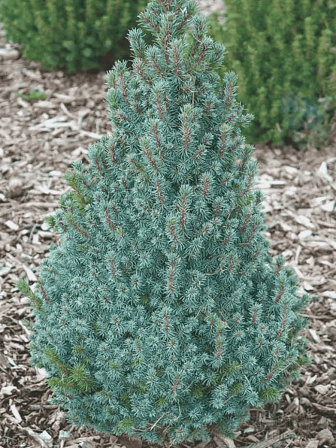 Саженцы Ели канадской Сандерс Блю (Sander's Blue) – карликовое медленнорастущее дерево пирамидальной формы с кроной нежно-голубого окраса. За первые 10 лет вырастает на 70-80 сантиметров в высоту, а позже может вырасти до 300 сантиметров в длину и 200 сантиметров в ширину. Побеги плотно прилегают к стволу.