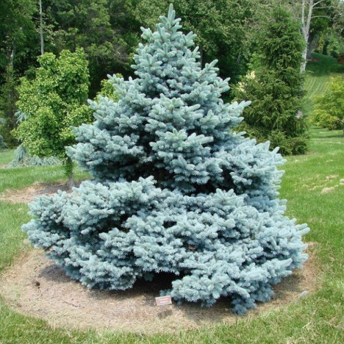 Саженцы Ели колючей Монтгомери (Picea montgomeri) — это популярный сорт, который ценится за декоративный вид и неприхотливость в уходе. Взрослые деревья редко превышают 1,5 м в высоту, но отдельные представители могут вырастать до 2 м. Они отлично подходят для выращивания в умеренном климате, стойко переносят заморозки и не нуждаются в укрытии. Главная особенность ели Монтгомери — ее сизая хвоя с серебристым оттенком. Она густая и пышная, годовой прирост составляет не более 6 см. Крона у этого сорта широкая и раскидистая, формируется в виде правильного конуса даже без регулярной обрезки. Деревья отлично смотрятся в парках и зонах отдыха, подходят для домашнего выращивания.