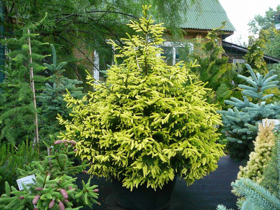 Саженец ели восточной Ауреоспиката (Aureospicata) вырастет в достаточно высокое дерево (8-25 м) с рыхлой конусовидной асимметричной кроной (до 8 м в диаметре). Декоративные особенности сорта: