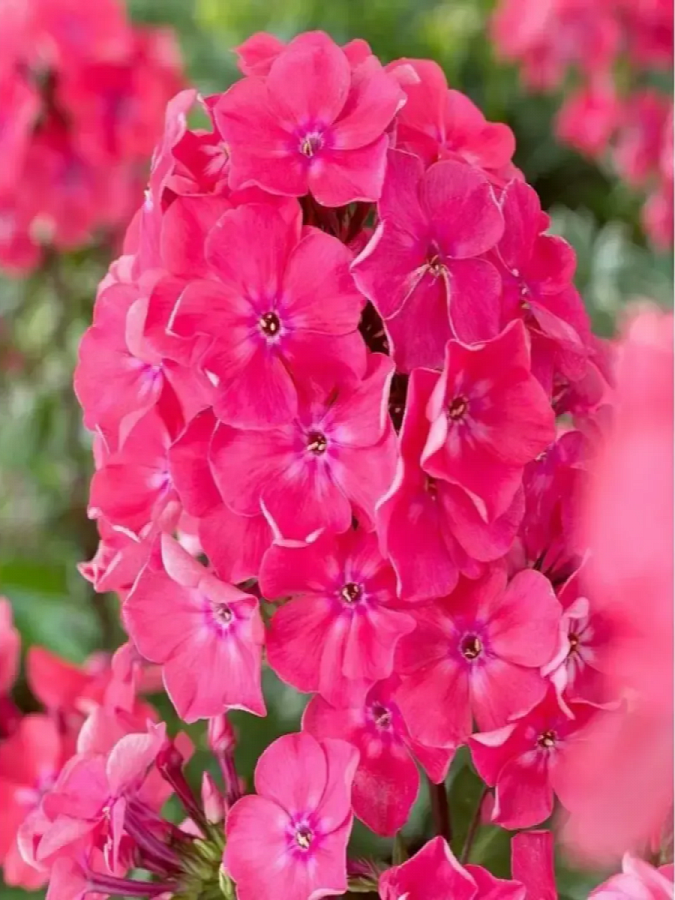 Флокс метельчатый вотермелон панч - это удивительное растение с ароматными цветками, окрашенными в арбузно-розовый или лососево-розовый оттенок с белой звездочкой. Этот сорт флокса поражает своей красотой и изяществом. Высота растения достигает до 40 см, что делает его идеальным для групповых посадок или одиночных насаждений. Листья флокса метельчатого имеют светло-зеленую окраску, создавая прекрасный контраст с яркими цветами.