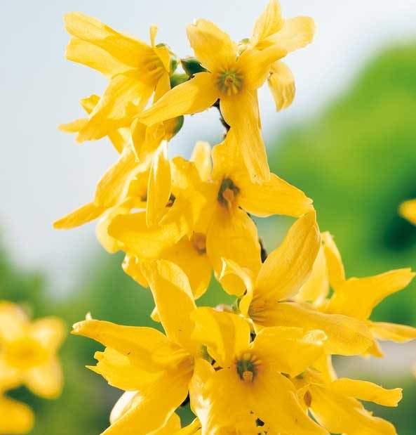Форзиция промежуточная Golden Time - это настоящее сокровище для вашего сада! Ее стволы украшены яркими желтыми цветами, которые расцветают в начале весны, наполняя воздух невероятным ароматом. Растение может достигать высоты до 2 метров, а диаметр кроны составляет 130-150 см, создавая великолепный зелено-желтый ковер.