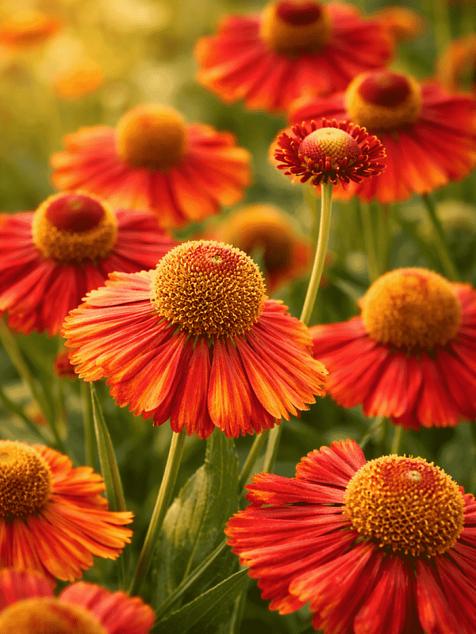 Рассада гелениума гибридного Моерхеим Бьюти (Moerheim Beauty) прекрасно дополнит осенне-цветущие растения, напоминающие об уходящем лете. Прямостоячие стебли к верхушке немного разветвленные. Цветение обильное с начала августа и до осенних холодов. Многочисленные соцветия корзиночки обладают насыщенным оранжево-красным оттенком с желтоватыми переливами.