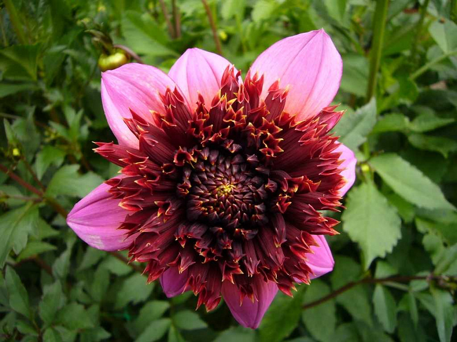 Окраска цветка : пурпурно-бордовым центром и "юбкой" из ярко-розовых лепестков