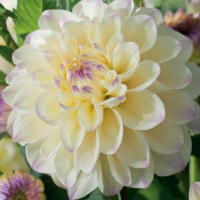 Георгина декоративная Лейк Кери - это великолепное растение с кремовыми цветками, украшенными нежными сиреневыми 'подпалинами' по краю лепестков. Ее стебель достигает высоты до 50 см, а размер цветка составляет 12 см. Листья георгины имеют интересную форму и образуют 7 лепестков. Это растение предпочитает солнечные места и дренированные богатые почвы.