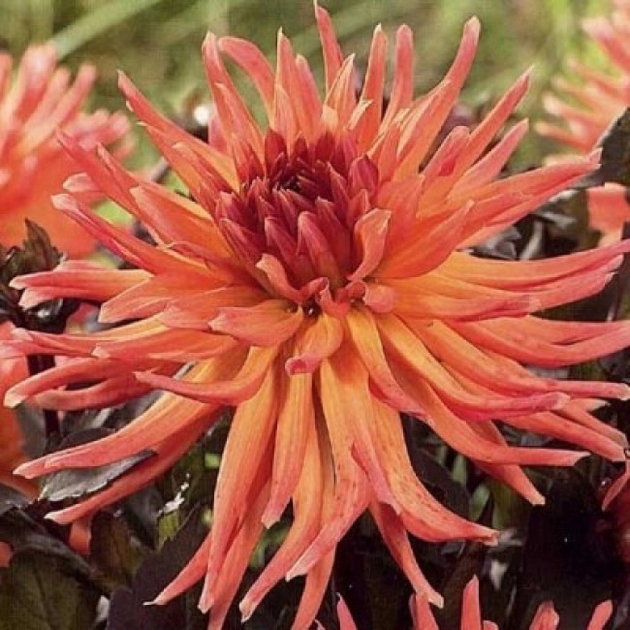 Саженцы и рассада кактусовой георгины Сити оф Алкмаар (Dahlia cultorum) представляют довольно молодой новозеландский сорт, уже успевший хорошо себя зарекомендовать. Узкие и длинные лепестки, характерные для всех кактусовых георгин, образуют оранжевый цветок среднего размера.