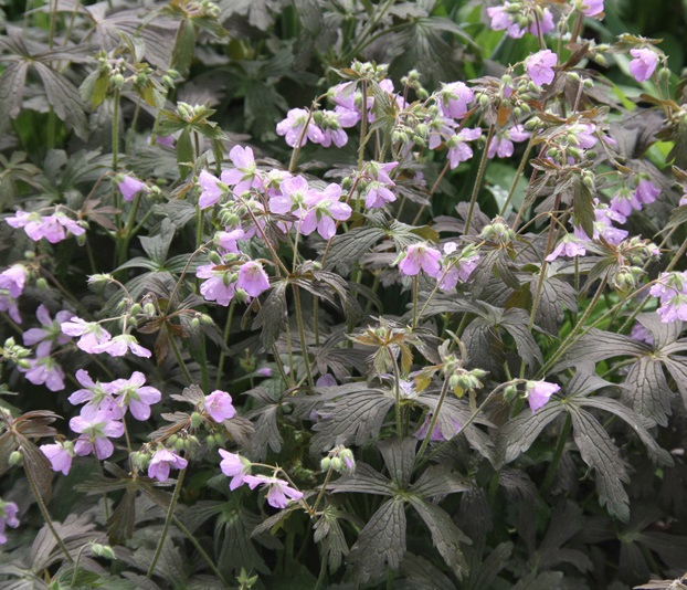 Рассада герани пятнистой Espresso (Эспрессо) отличается необычной листвой, похожей на резные шоколадки. Осенью цвет листиков становится золотистым, а в сочетании с повторно зацветающими соцветиями вид растения очень декоративен. Высота круглого аккуратного куста в среднем 30-40 см, чашечки цветов розово-лавандовые миниатюрные. Быстро растет, может притеснять окружающие растение, нужно удалять лишние побеги. Семена из коробочек разлетаются широко.