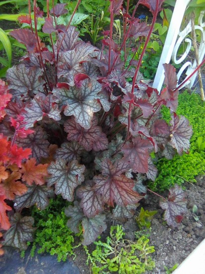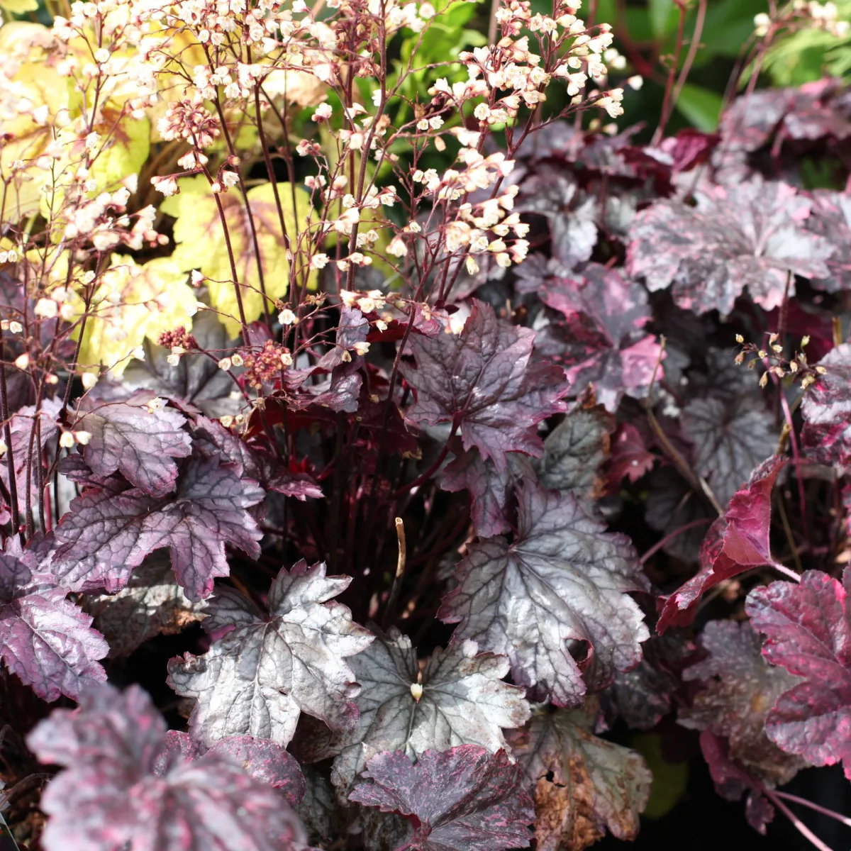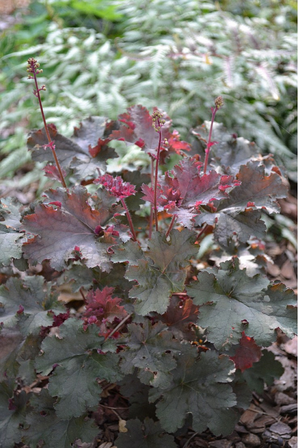 Рассада гейхеры Фаерворкс (Fireworks) порадует длительным цветением с мая по август. В это время среди коричнево-зеленых листьев пробиваются многочисленные длинные стебли с нежными кораллово-розовыми цветочками. Этот сорт гармонично вписывается в посадки с розами, геранями, баданом и декоративными злаками.