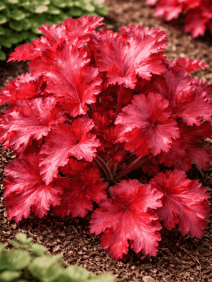 Гейхера forever red - это великолепное растение с ярко-красными листьями, которые будут радовать ваш взгляд на протяжении всего лета. Этот сорт гейхеры отличается компактным размером до 30-40 см в высоту и диаметре, что делает его идеальным выбором для групповых или одиночных посадок в саду. Цветки гейхеры forever red белые, что создает прекрасный контраст с яркой листвой.
