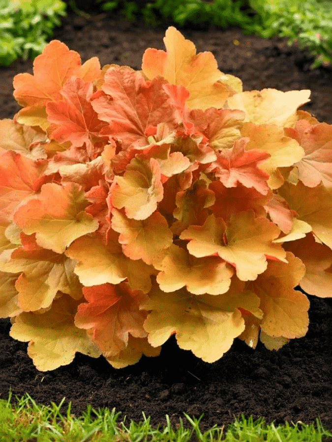 Рассада гейхеры Мега Карамель (Mega Caramel) станет ярким акцентом любой комбинированной посадки. Невысокий куст с рыжими листьями и белыми цветами гармонично впишется в клумбу с геранями, баданом или декоративными злаками. Этот сорт можно использовать для заполнения пустых мест сада или участков под высокими деревьями или кустарниками.