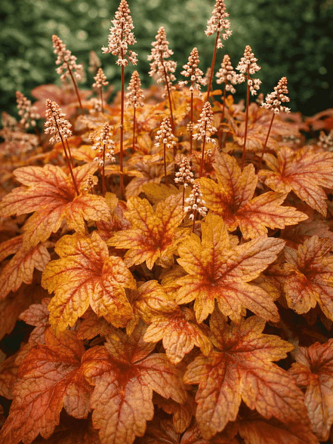 Саженцы гейхереллы Brass lantern отлично растут и цветут как на солнце, так в тени. Почвы лучше всего выбирать плодородные, рыхленные, с умеренным увлажнением. Это неприхотливое к условиям и устойчивое к вредителям растение. Растет быстро и формирует пышную розетку ярких листочков, которые по форме напоминают кленовые. Листва окрашена в золотистые, медные и красноватые оттенки. В июне белые цветы красиво возвышаются над листьями. Высота гейхереллы Brass lantern достигает всего 30 см, ширина кустарника может быть до 50-60 см. Растение хорошо использовать в смешанных посадках, бордюрах, для выращивания контейнерах.