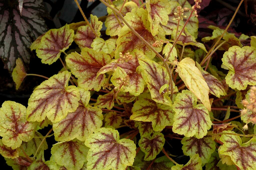 Рассада гейхереллы Голд Каскад (Gold Cascade) станет изюминкой садового ландшафта. Этот сорт привлекает внимание необычной окраской – желто-золотистые листья покрывает узор красно-бордовых прожилок. В июле среди листвы появляются цветоносы с кремово-белыми цветочками. Красивый многолетник гармонично смотрится в смешанных композициях, а также красив в одиночных посадках.