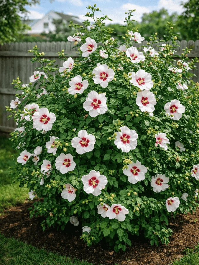 Гибискус сирийский shintaeyang - это великолепное растение с изысканными белыми цветками и красным центром, которые радуют глаз своей красотой в июне и октябре. Сорт hibiscus syriacus обладает стволом прочным и устойчивым, достигающим высоты до 150-200 см. Листья гибискуса имеют элегантную форму и придают растению особый шарм.
