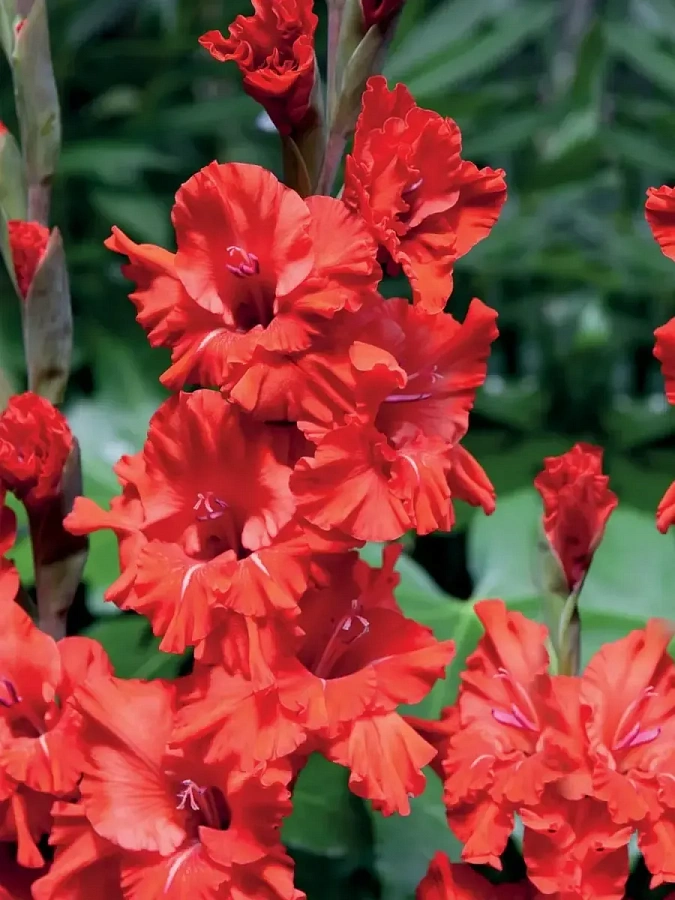 Луковицы гладиолуса гибридного Файер Раффл (Fire Ruffle) украсят ваш участок ярким оттенком цветущих бутонов. Растение эффектное, предназначено для высадки в открытом грунте на солнечных участках. Во время цветения требовательно к поливу. Высота этого сорта гладиолуса около 1 метра, средний диаметр цветка – 12 сантиметров. Бутоны яркие, насыщенного красного оттенка, видны издалека. Цветет долго, начиная с июня и заканчивая к сентябрю. Цветок идеально подходит для произрастания на клумбах, желательно на втором плане, чтобы не перебивать вид яркой расцветкой. Хорош в букетах.