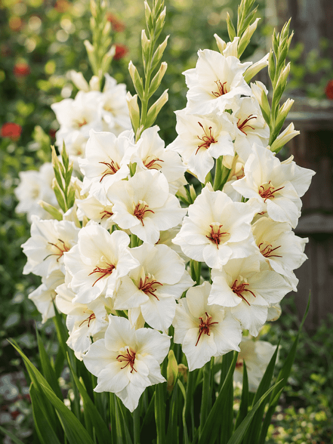 Луковицы Гладиолуса гибридного Сильверстрек (Silverstreak) способны удивить самого искушенного цветовода — посаженные в теплую почву со слабокислой реакцией, они выпускают соцветия высотой до 120 сантиметров. В июле на них распускаются многочисленные простые воронковидные цветки сливочного цвета. Но изюминка цветка — это один или два штриха терракотового или малинового цвета. Мечевидные листья не превышают 80 сантиметров в высоту и подчеркивают изысканность пышных соцветий. Чтобы предотвратить поломку или полегание стеблей, их аккуратно подвязывают к опоре или окучивают на 10 сантиметров.