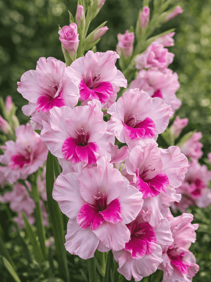 Гладиолус гофрированный сакраменто раффл - это изысканное растение с неповторимой красотой цветков. Его стебель достигает высоты до 110 см, а размер цветка составляет 11-12 см. Цветение начинается в июле и продолжается до октября, радуя глаз своими светло-розово-сиреневыми оттенками. Листья гладиолуса зеленеют весной и остаются такими же летом, создавая прекрасный контраст с яркими цветами.