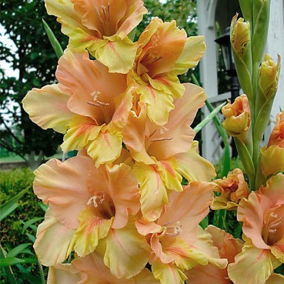 Гладиолус крупноцветковый "Кейн" - это великолепное растение, которое поразит вас своей красотой и изяществом. Его стебель прочный и прямой, достигает внушительной высоты, а крупные цветки лососево-персикового оттенка привлекают взгляды и создают неповторимую атмосферу в вашем саду.