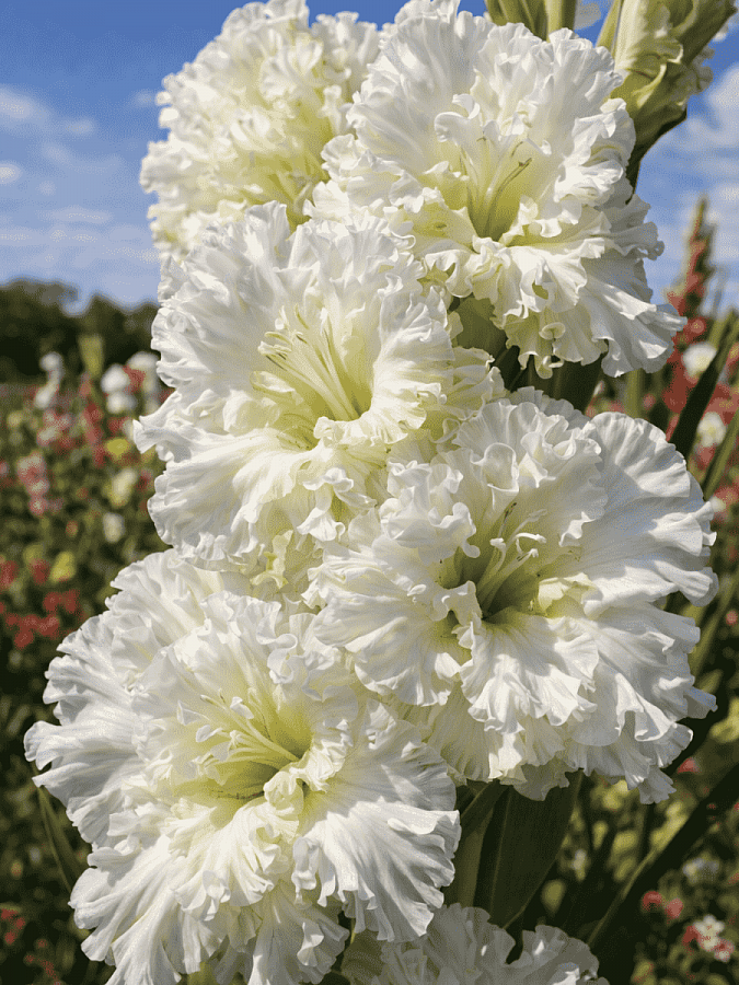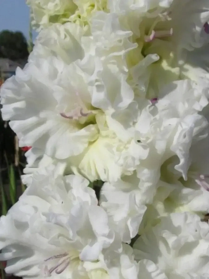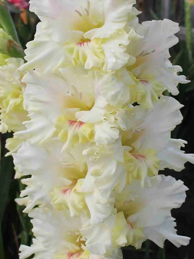 Гладиолус octopus - это удивительное растение с белыми, сильно гофрированными цветками, которые привлекают внимание своей красотой. Этот сорт гладиолуса отличается высотой от 110 до 150 см и цветет в июле и сентябре, радуя глаз своими яркими бутонами. Листья гладиолуса octopus имеют интересную форму и добавляют декоративности этому растению.