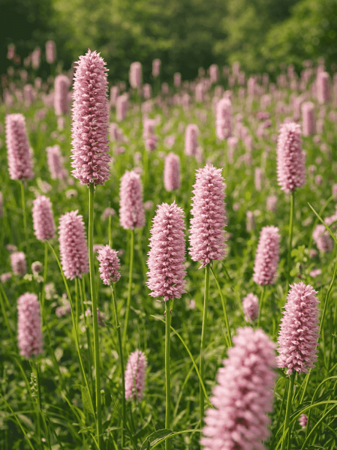 Горец змеиный, или persicaria bistorta, - это удивительное растение с ярко-розовыми цветками, которые расцветают в мае и июне. Его стебли достигают высоты до 75 см, создавая неповторимый вид в вашем саду. Летом листва горца змеиного приобретает зеленый оттенок, что делает его еще более привлекательным.