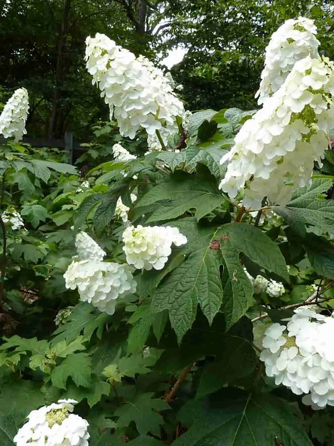 Саженцы гортензии дуболистной (Hydrangea quercifolia) вырастают крупным листовидным кустиком около 2 метров в высоту. Листва крупная, широкая и имеет трехлопастную форму. По краям листики слегка зазубрены и составляют около 25 см в длину. Летом листва темно-зеленая, а осенью становится багряной. В июне зацветает беленькими цветочками, которые собраны в крупную, конусовидную форму. Плюсы гортензии дуболистной: