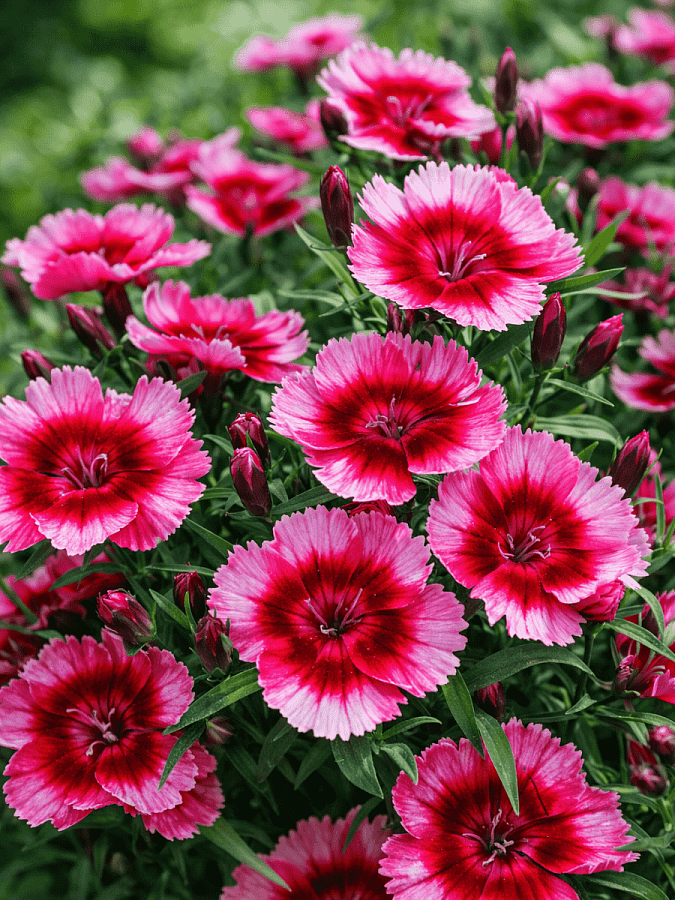 Гвоздика китайская coronet rasberry - это изысканное растение с малиново-розовыми цветками, которые радуют глаз в июле и октябре. Ее стебель достигает высоты до 20 см, а диаметр цветка может достигать 25 см. Листья гвоздики зеленые, создавая яркий контраст с цветками. Это растение отлично подходит для групповых и одиночных посадок в саду.