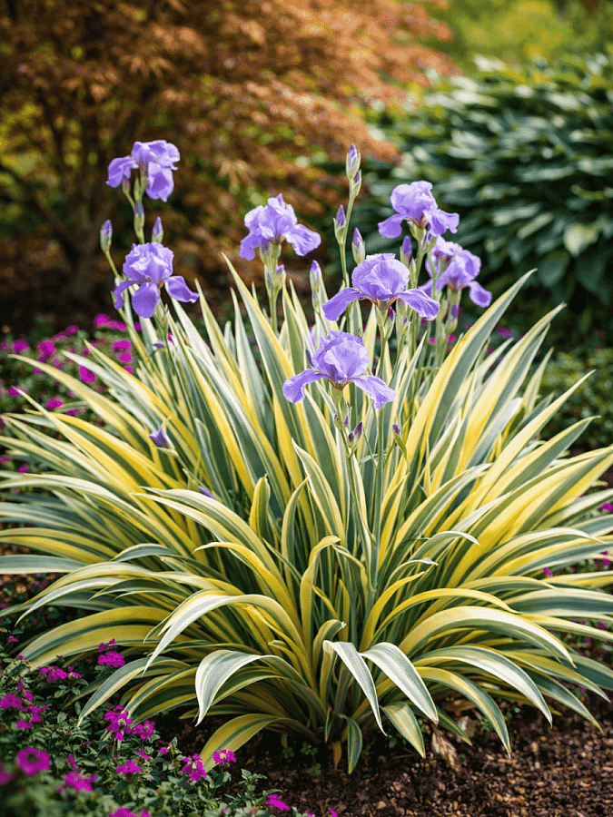 Ирис бледный aureovariegata - это изысканное растение с нежно-фиолетовыми цветками, которые расцветают в июне, придавая вашему саду неповторимый шарм. Его зеленые листья с желтой полосой создают яркий контраст и привлекают взгляды как солнечным днем, так и вечером. Высота растения достигает до 80 см, что делает его идеальным выбором для групповых или одиночных посадок в саду.