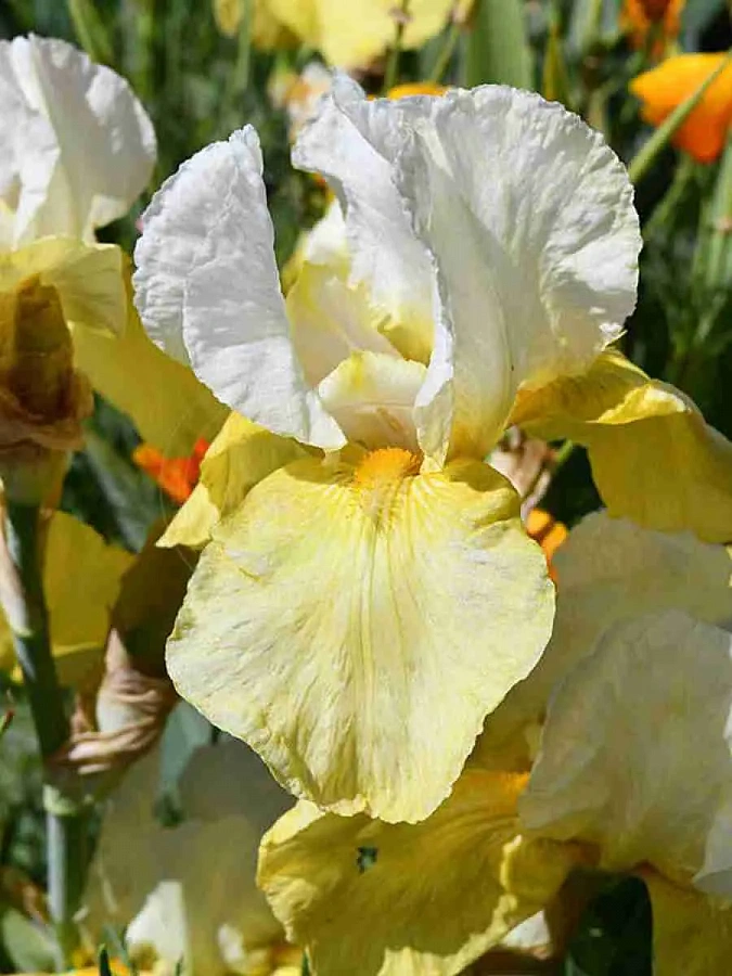 Ирис германский Glacier Gold - это великолепное растение с изысканными белыми стандартами и светло-желтыми фолами, которое поражает своей красотой. Этот ирис достигает высоты до 80-90 см и радует своим цветением в мае и июне. Его крупные цветки диаметром 10 см привлекают внимание и создают неповторимый вид в саду.