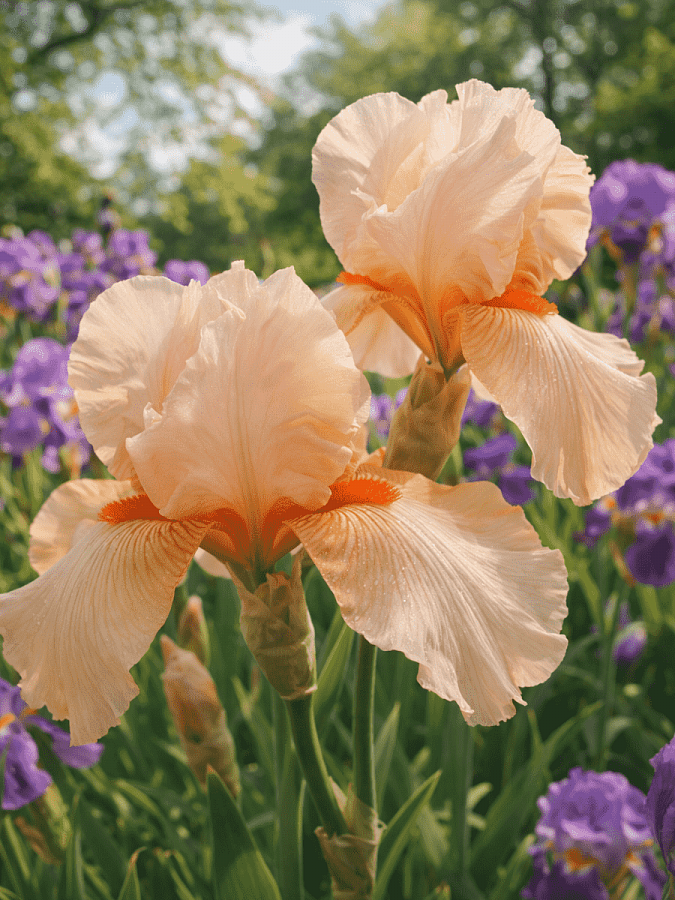 Ирис германский constant wattez - это изысканное растение с кремово-розовыми цветками, которое поразит ваш взгляд своей красотой. Сорт этого ириса отличается высотой до 120 см и размером цветка до 15 см, что делает его настоящим королем сада. Летом листва приобретает светло-зеленый оттенок, создавая яркий контраст с цветками.