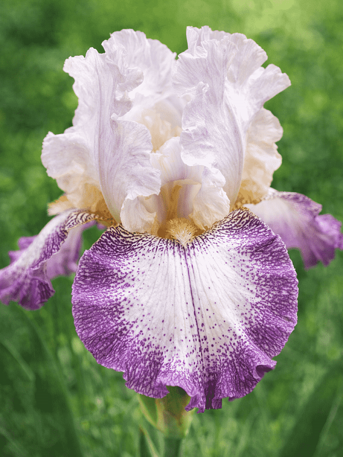 Ирис германский lucky locket - это изысканное растение с кремово-белыми цветками, украшенными фиолетовым оттенком. Его высота достигает до 60 см, а размер цветка может достигать до 15 см. Летом листва приобретает светло-зеленый оттенок, создавая яркий контраст с цветами. Этот ирис предпочитает солнечные места и подходит для групповых и одиночных посадок в саду.