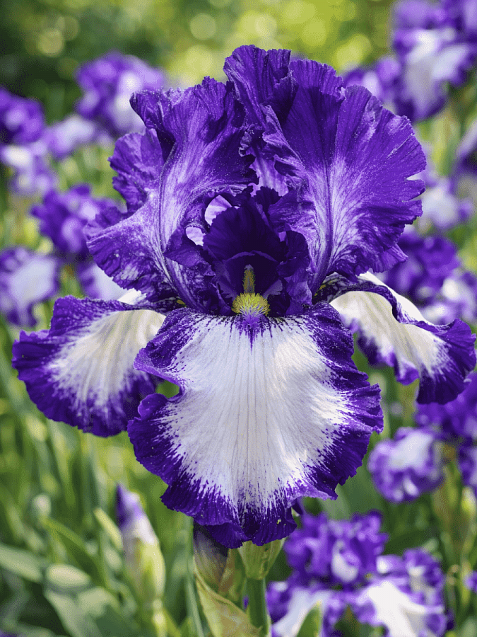 Ирис германский stepping out - это великолепное растение с изящными фиолетово-белыми цветками, которые будут радовать ваш взгляд в мае и июне. Сорт отличается высотой до 100 см, что делает его прекрасным украшением для сада. Листья ириса имеют светло-зеленую летнюю окраску, создавая яркий контраст с цветками. Растение предпочитает солнечные места и может быть посажено как в групповые, так и одиночные посадки.