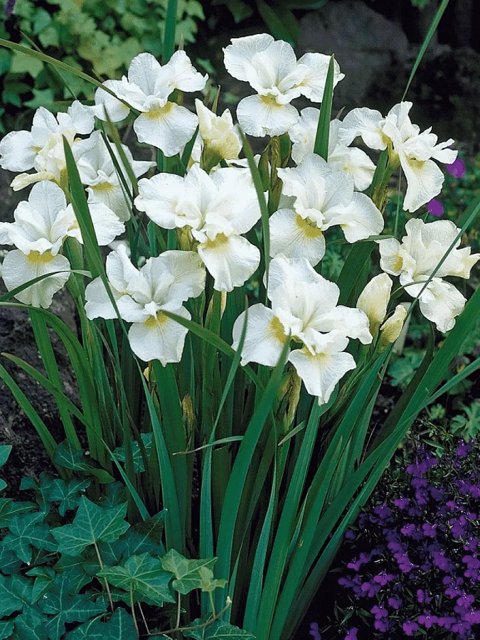 Ирис сибирский Gallz Uing - это великолепное растение, которое поразит вас своей красотой и изяществом. Его стебель достигает высоты до 90 см, а цветки белого цвета с ярким желтым центром привлекают внимание своей нежностью и изысканностью. Листья зеленого цвета создают прекрасный контраст с цветами, делая растение еще более привлекательным.