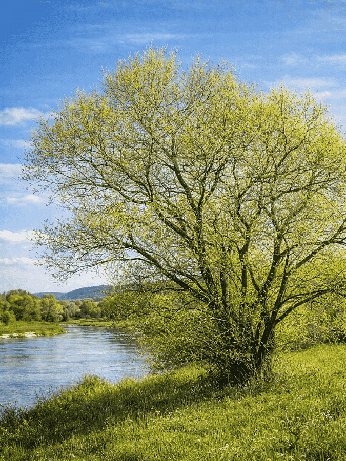 Листья ивы белой имеют форму, напоминающую перо, что добавляет ей легкости и воздушности. Весной они радуют темно-зеленым оттенком, летом сохраняют свою красоту, а осенью окрашиваются в яркую желтую гамму, создавая неповторимый колорит.