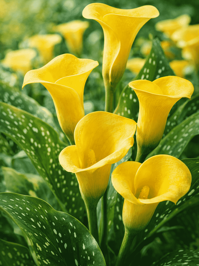 Луковицы Каллы гибридной Блек Меджик (Black Magic Calla) выпускают цветоносы с необычными цветками. По виду они такие же, как и большинство соцветий калл. Ярко-желтый початок укутан зеленовато-желтым покрывалом. Но нижняя внутренняя часть «бокала» окрашена в темно-коричневый цвет. Стреловидные листья крупные и блестящие. Они темно-зеленого цвета, покрыты серебристыми большими вкраплениями. Соцветие держится на кусте в течение 1,5 месяцев. В срезке оно простоит в первозданном виде 5–7 дней. Срезать соцветия необходимо до образования семян, тогда луковица успевает запастись питательными веществами перед зимовкой.