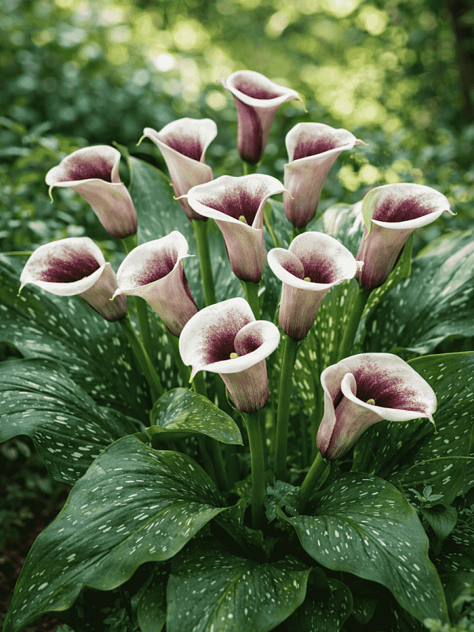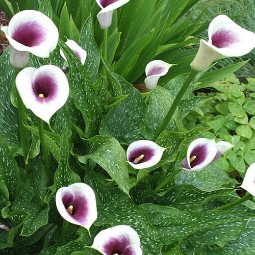 Необычная расцветка этого тропического растение привлечет внимание любителей цветов – шикарная Калла Пикассо (Calla Picasso) обладает необычайном окрасом. В глубине белого бутона затаилась синева ночного неба, по листьям растения рассыпались белые капельки крапа. Растение настолько декоративно, что сразу же привлекает внимание. Выращивать этот сорт можно в открытом грунте и горшках, любит обильный полив. Предпочитает немного затененные места, хорошую почву и дренажом. В открытый грунт высаживается только после последних морозов. После цветения желательно удалять лишние листья. Красива в одиночных посадках и клумбах.