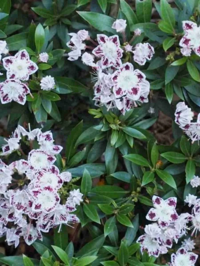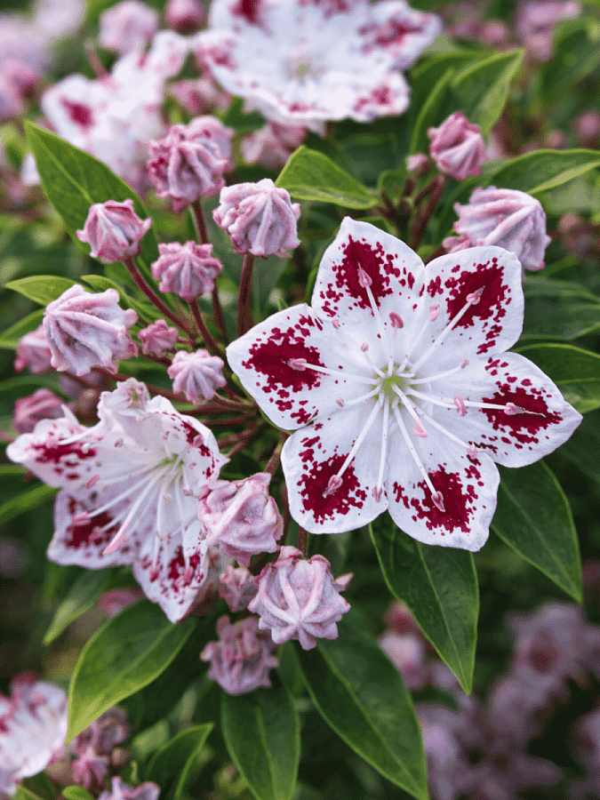 Кальмия широколистная star magic - это волшебное растение, которое поразит вас своей красотой и изяществом. Ее ствол прочный и устойчивый, а размеры достигают до 130 см в высоту, что делает ее идеальным выбором для групповых или одиночных посадок. Листья кальмии широколистной имеют темно-зеленую окраску, а цветки бело-розово-бордовые, размером до 3 см. Время цветения - май и июнь, что создает неповторимую атмосферу в вашем саду.