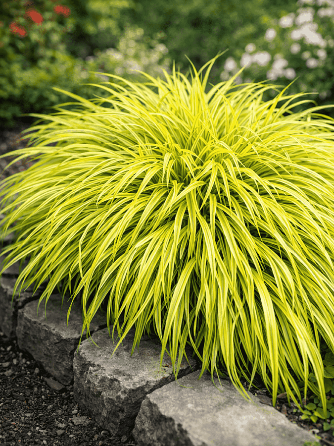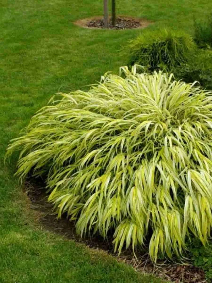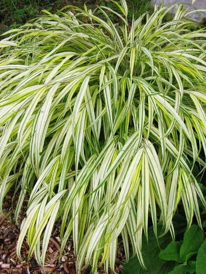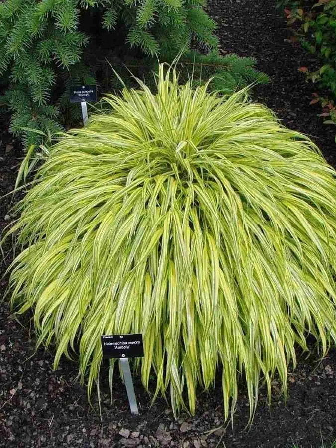 Саженцы Хаконехлоа большой Aureola (Hakonechloa macra) имеют широкие листья смешанного окраса. В летний период зелено-салатовые полосы чередуются с ярко-желтыми линиями. Осенью в цветовой гамме добавляется розовый оттенок. Растет в хорошо дренированных почвах на солнечных безветренных садовых участках. В регионах с более жарким климатом можно выбирать слегка затененное место ― это поможет избежать выцветания листьев. Цветет кустарник с июля по август, при этом на побегах появляются светло-коричневые соцветия. Сорт медленно растущий, однако непривередливый. Практически не нуждается в уходе: в большинстве случает достаточно полива в засушливые периоды. Aureola используется ландшафтными дизайнерами для групповых посадок. Хорошо сочетается со злаковыми.